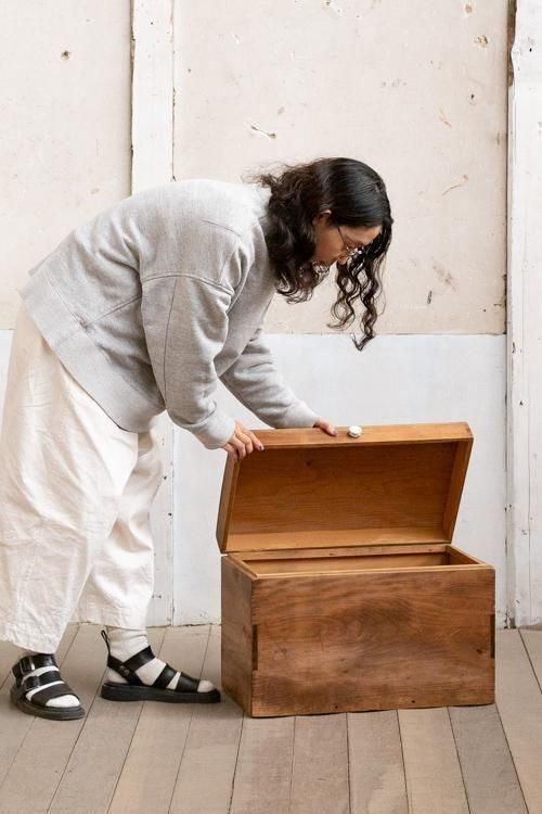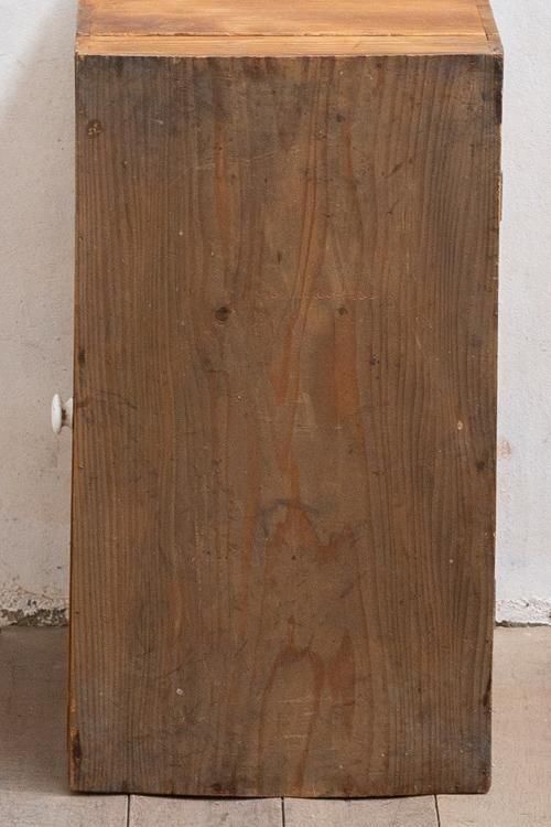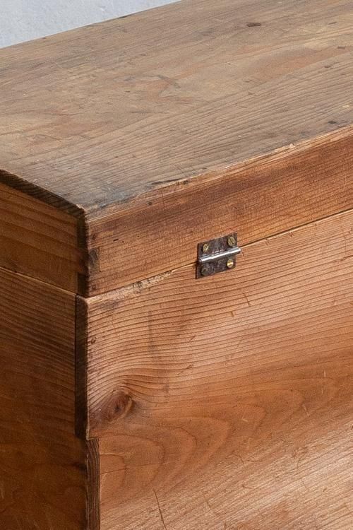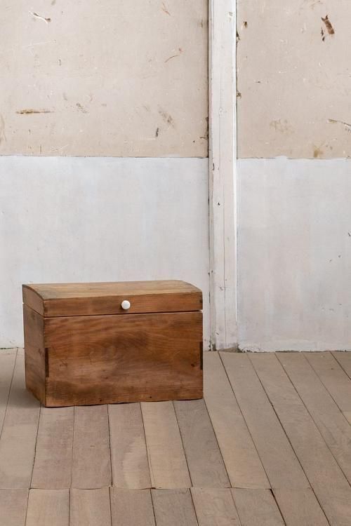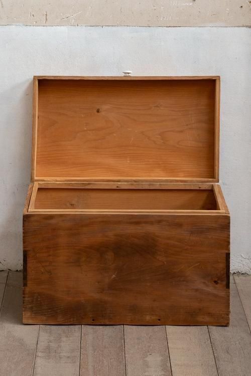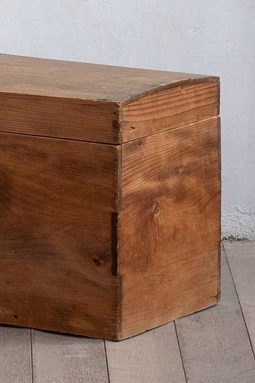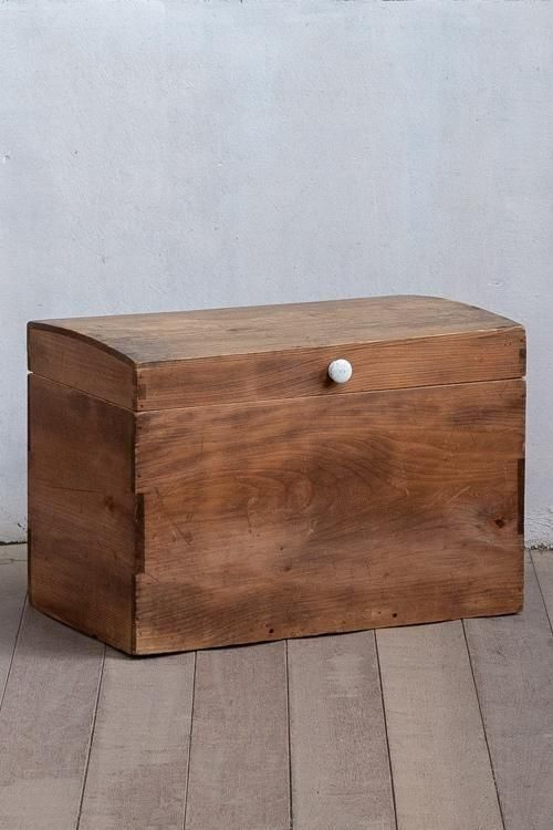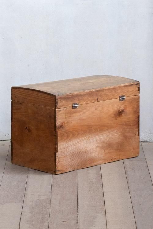 木製の蓋付き木箱。上部はかまぼこ形のゆるやかなアーチになっています。
