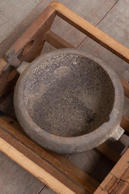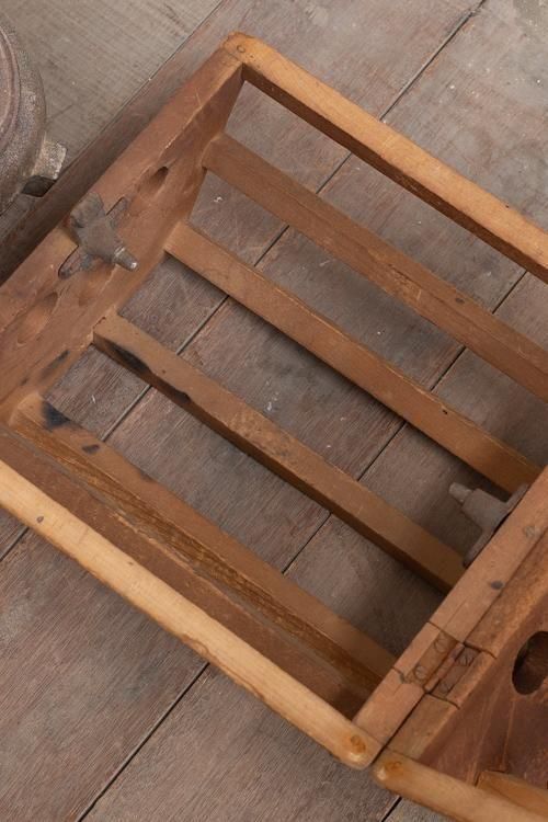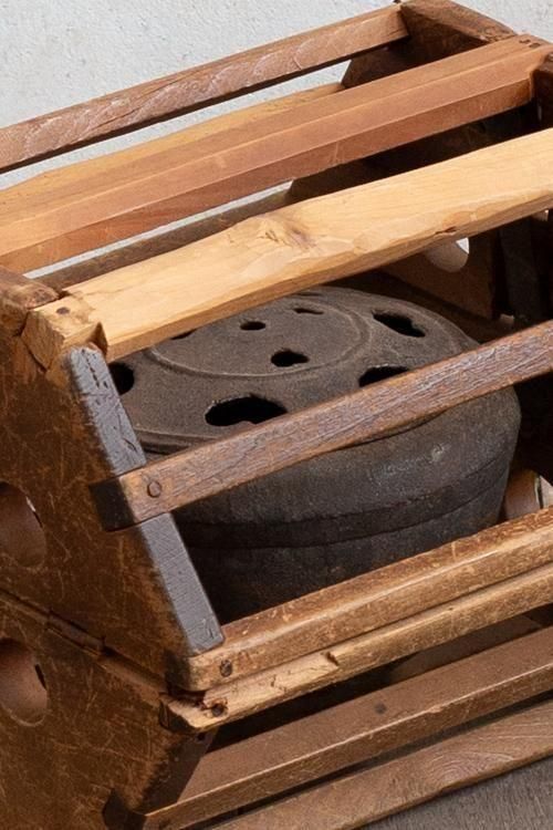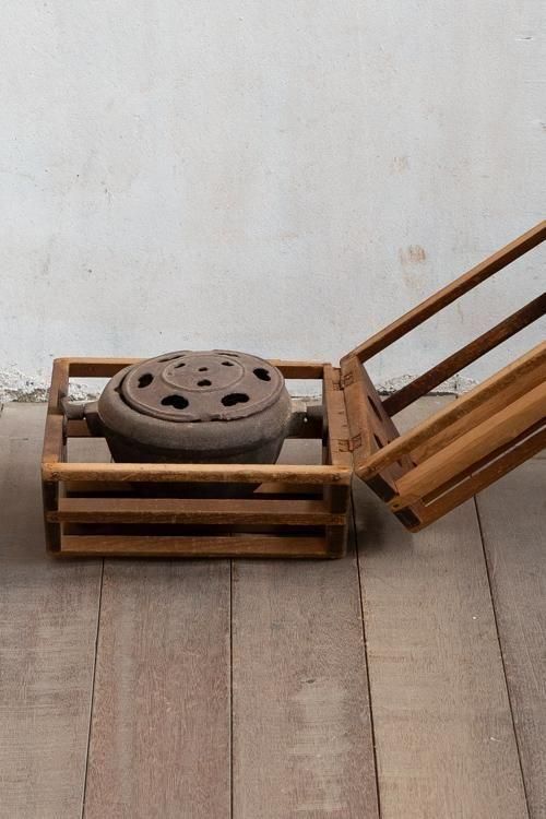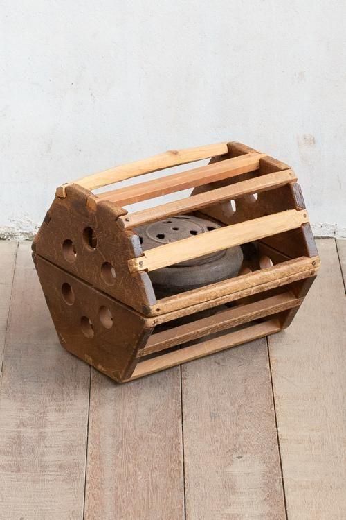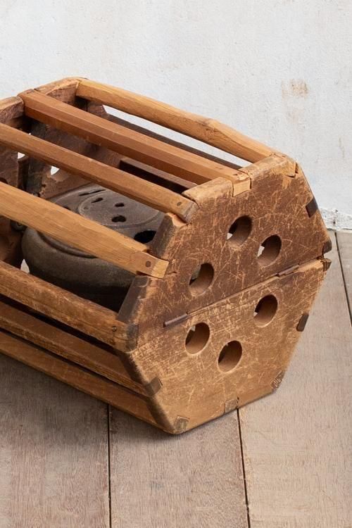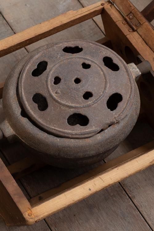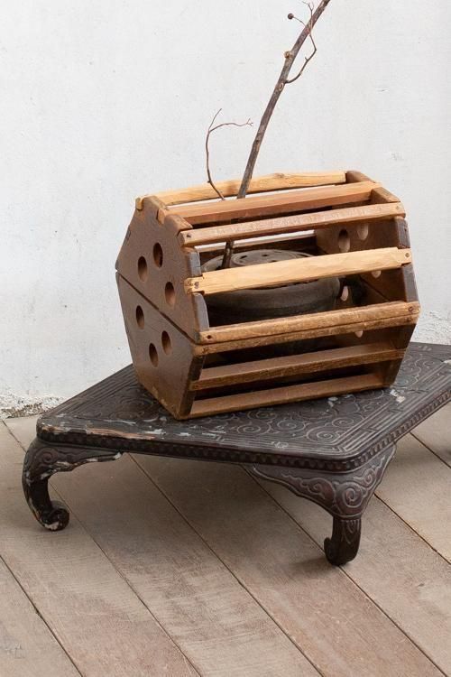古い炬燵。花生けやディスプレイなどにもお使いいただけます。*木枠を開くと、鉄器が外れます。