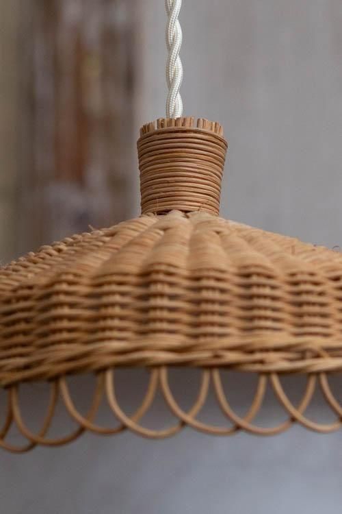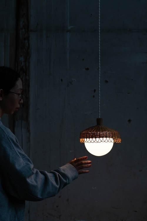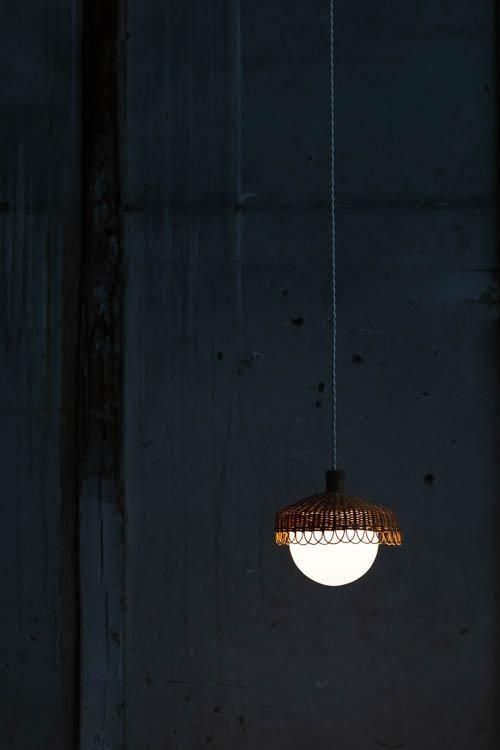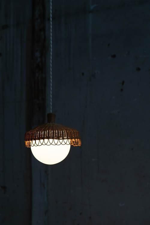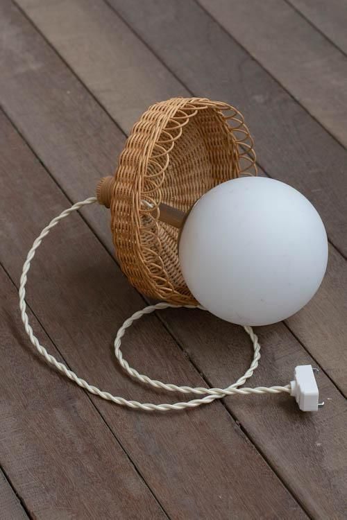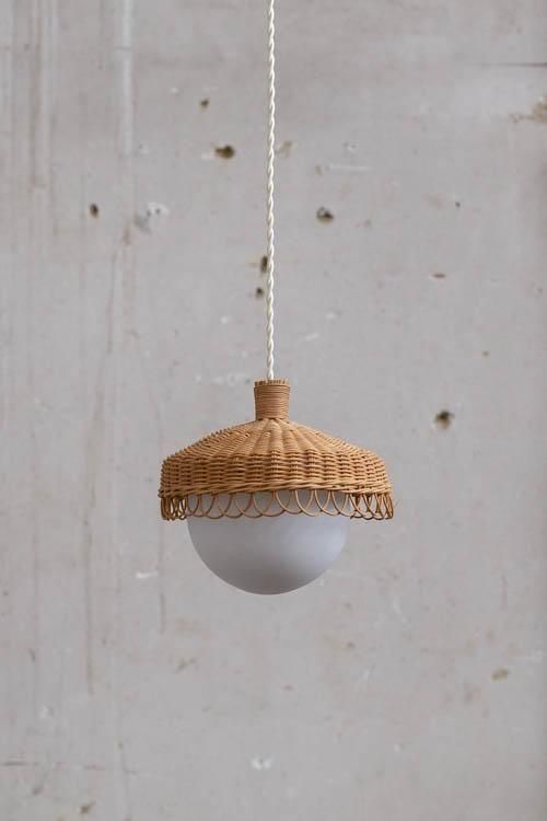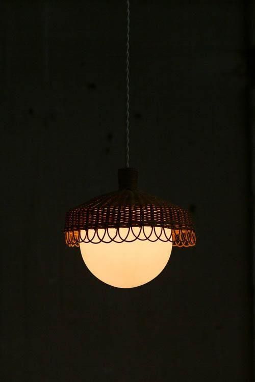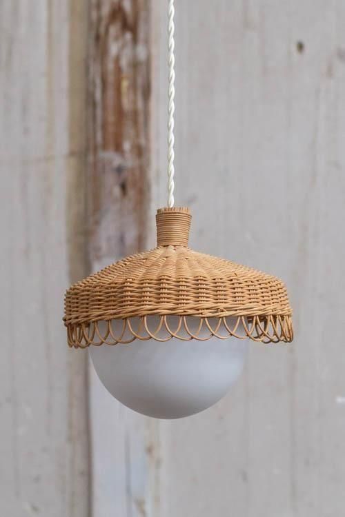 乳白ガラスボールと籐網シェードのペンダントライト。